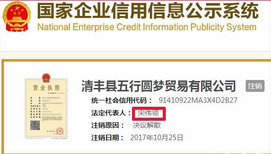 另外还值得一提的是,云为国际公司是由清丰县五行圆梦贸易有限公司(以下简称:五行圆梦公司)法人宋某领在2017年11月8日注册成立的。五行圆梦公司同样向“云数贸”传销会员提供商品和便利条件。