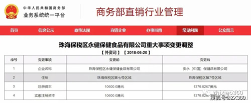 据商务部直销行业管理平台显示,安永国际于2017年5月正式获得第87块直销牌照,是一家港资企业。安永原名为“珠海保税区永健保健食品有限公司”,而后在2018年正式更名为安永(中国)保健品有限公司。
