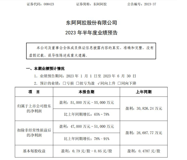 道道网讯 7月6日,东阿阿胶股份有限公司发布2023 年半年度业绩预告,预计上半年净利润5.1亿元-5.5亿元,同比增长65%–78%。东阿阿胶块市场份额明显提升,复方阿胶浆大品种战略持续发力,桃花姬阿胶糕全渠道实现快速增长,经营业绩稳步提升。