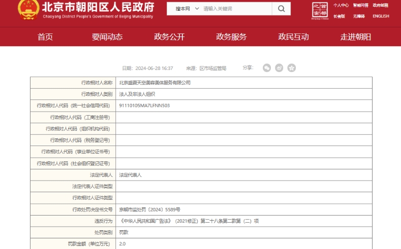 北京市朝阳区人民政府官网显示,北京盛夏天空美容美体服务有限公司(以下简称为“当事人”)违反《中华人民共和国广告法》,被北京市朝阳区市场监督管理局罚款2万元。