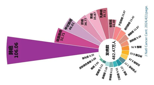 国家癌症中心相关数据显示:2022年我国恶性肿瘤新发病例为482.47万,男性发病率高于女性。其中,排名前十的癌种分别为肺癌106.06万、结直肠癌51.71万、甲状腺癌46.61万、肝癌36.77万、胃癌35.87万、乳腺癌35.72万、食管癌22.40万、子宫颈癌15.07万、前列腺癌13.42万、胰腺癌11.87万。