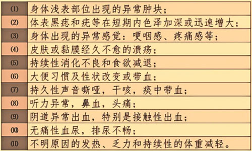 癌症的治疗效果和生存时间与癌症发现的早晚密切相关,发现越早,治疗效果越好,生存时间越长。关注身体出现的癌症危险信号,出现以下症状应及时到医院进行诊治,包括: